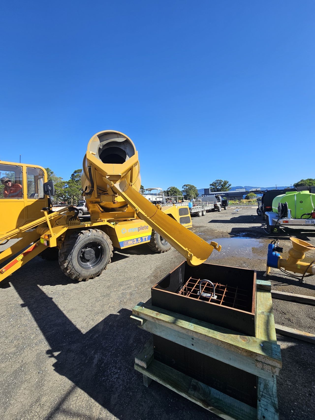 The Carmix 3.5TT loading arm is equipped with a self-articulated hydraulically operated 600 litre shovel with opening gate that allows accurate loading of aggregates and cement. Additionally the Carmix 3.5TT has two 400 litre tanks with a water pump capable of pumping 400 litres per minute to allow efficient addition of water to drum during batching.